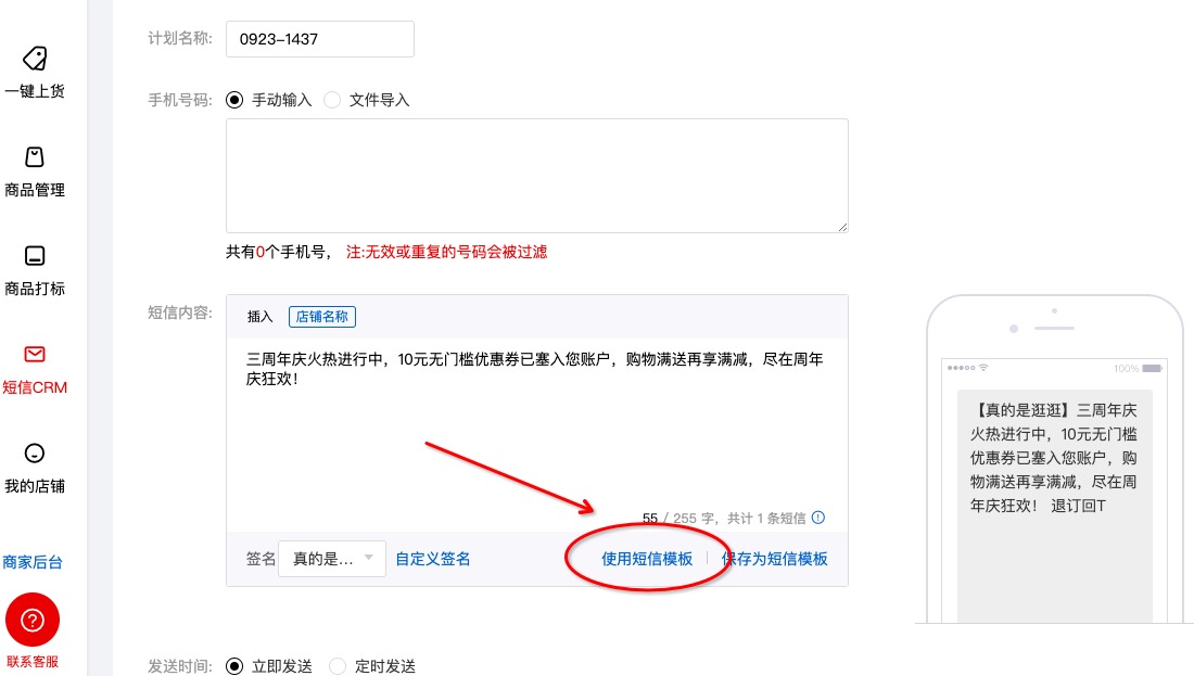 步驟四:設(shè)置短信發(fā)送時(shí)間,立即發(fā)送或者定時(shí)發(fā)送,最后點(diǎn)擊發(fā)送短信即可。