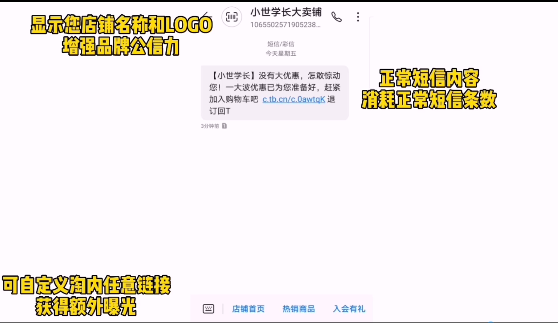 (3)利用歡樂逛的“短信公眾號”功能,可以在客戶瀏覽短信時呈現店鋪logo及店鋪簽名,提高品牌忠誠度,打造良好的會員關系。同時底部菜單欄可直達店鋪首頁、會員中心等,商家們可以增加額外曝光量。