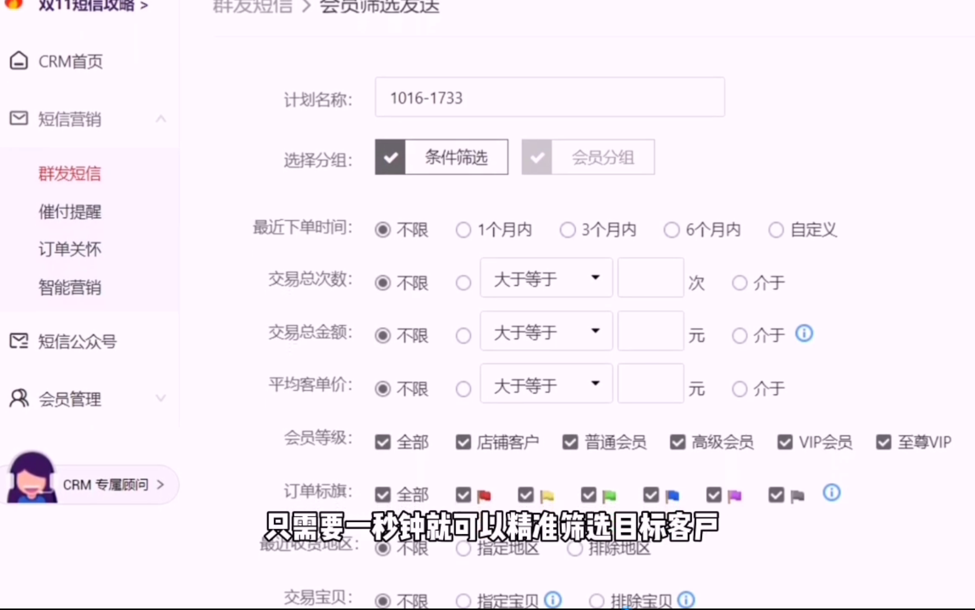 (2)利用歡樂逛的“會員篩選發送”,只需要幾分鐘就可以精確篩選目標客戶,有針對性地營銷,大大提高短信轉化率。